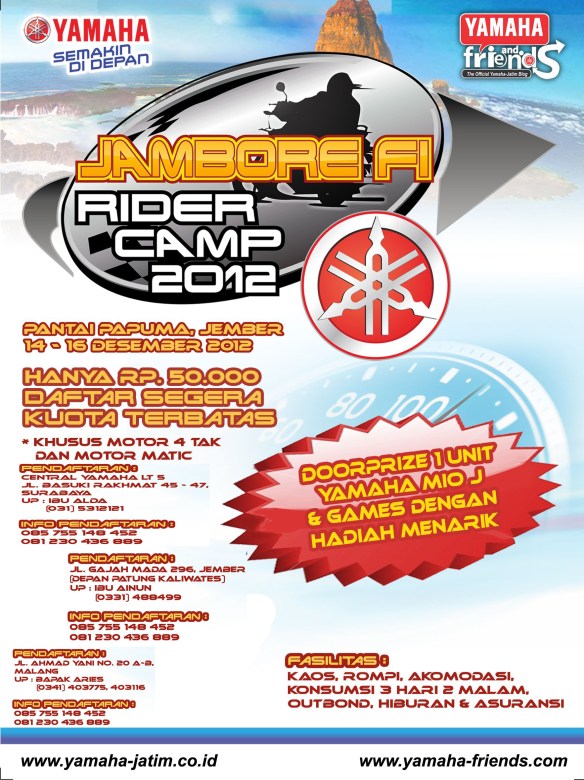 Sob, Ini dia  info yang selama ini banyak ditunggu-tunggu Rider rider Yamaha. Yaitu JAMBORE YAMAHA 2012, tentunya semakin seru dari tahun sebelumnya. Makanya jangan sampai ketinggalan untuk cepat-cepat mendaftarkan diri sobat semua, atau rombongan daftarnya dengan teman-teman Community juga boleh. Inilah syarat-syarat pendaftarannya sebagai berikut: