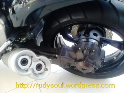 Dan mata ini tertuju pada penyalur tenaga mesin ke roda belakang.Oww…oww..oww…RSL baru tau kalau ternyata motor ini tidak menggunakan rantai,tapi menggunakan bluetut gardan 🙂