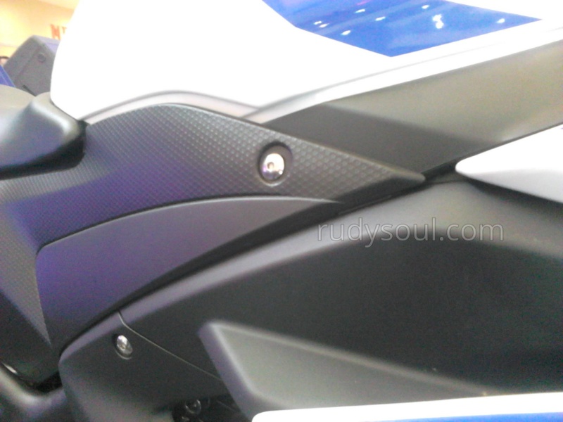 Dan ternyata benar adanya…..plastik dibawah tangki tidak sama,jika YZF-R25 yang di display di Surabaya (warna merah) plastiknya halus (tanpa pola) maka plastik yang di Malang (warna biru) ini kasar “carbon look”