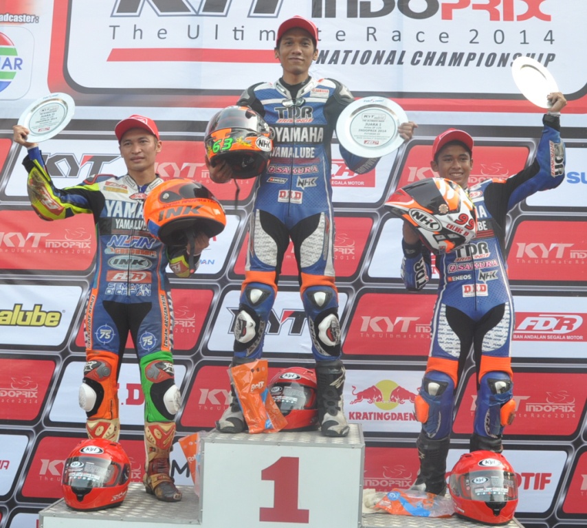 SENTUL-Yamaha mempersembahkan kemenangan seri ke-3 Indoprix 2014 untuk Denny Triyugo. Duka mendalam dunia otomotif Indonesia untuk rider yang wafat Minggu pagi 10 Agustus itu.