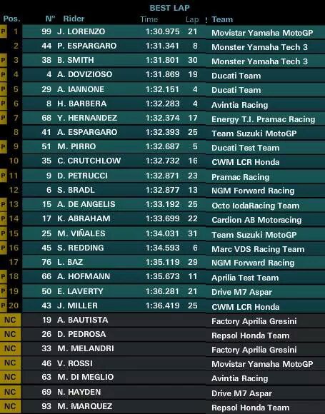 Cal berhasil menyelesaikan putaran sebanyak 26 lap dengan catata waktu 1:32.732,sebagai pembanding adalah catatan waktu terbaik Jorge Lorenzo 1:30.975 yang mampu memperoleh catatan terbaik ke1 saat uji coba hari ini.