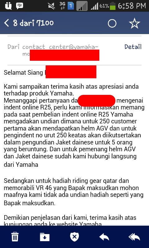 Naahh…ceritanya RSL mendapat curhatan dari salah satu indener online R25 yang merasa kecewa karena pembatalan hadiah tersebut,doi merasa dikecewakan lantaran dirasa panitia membatalkanya secara sepihak tanpa pemberitahuan terlebih dahulu.