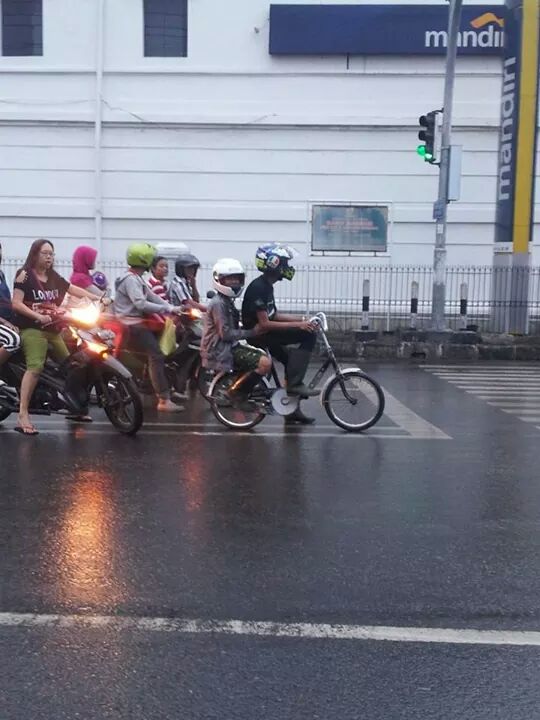 Yang naik motor gak pakai helm,yang naik sepeda pakai helm fullface.