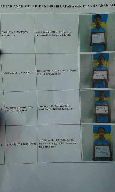Sob,pagi tadi RudySouL mendapatkan kabar telah kabur 4 tahanan dari lapas anak Blitar,dari 4 tahanan yang kabur dari lapas 1 sudah kembali pada pukul 11 siang atas nama Irfan yang diantarkan oleh orang tuanya.