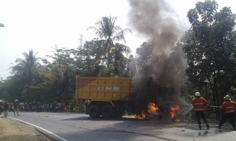 Sob,sepeda motor CBR150R meledak dihapan pemiliknya setelah motor terseret dan masuk kolong truk.