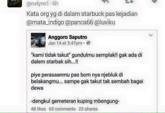 Hastag #kamitidaktakut tidak berlaku untuk mereka yang saat kejadian berada di dalam starbuck,kondisi nyawa terancam..ada bom yang siap meledak dalam hitungan detik saja.