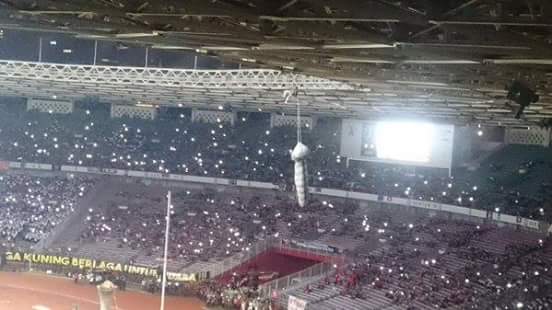 Seorang penerjun terlihat tersangkut di atap Stadion Utama Gelora Bung Karno (GBK),dan membuat ribuan suporter menjadi panik.