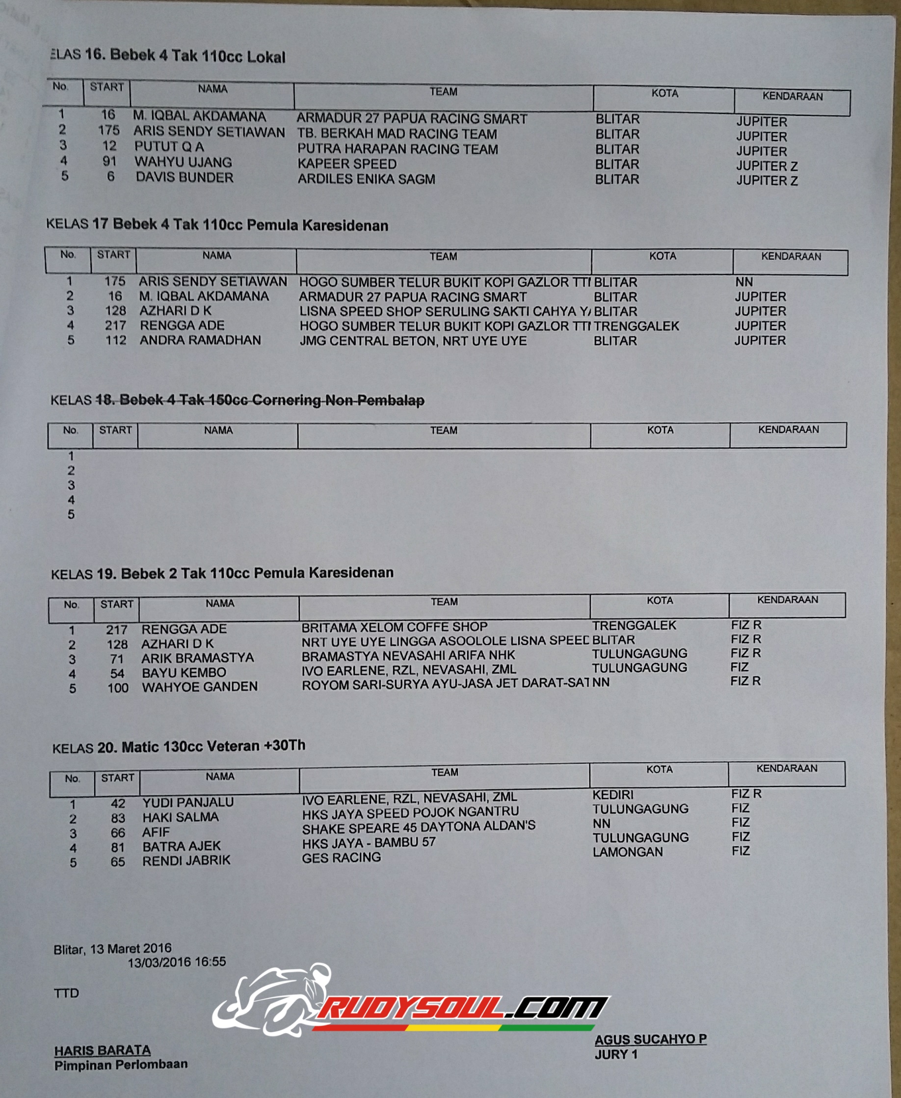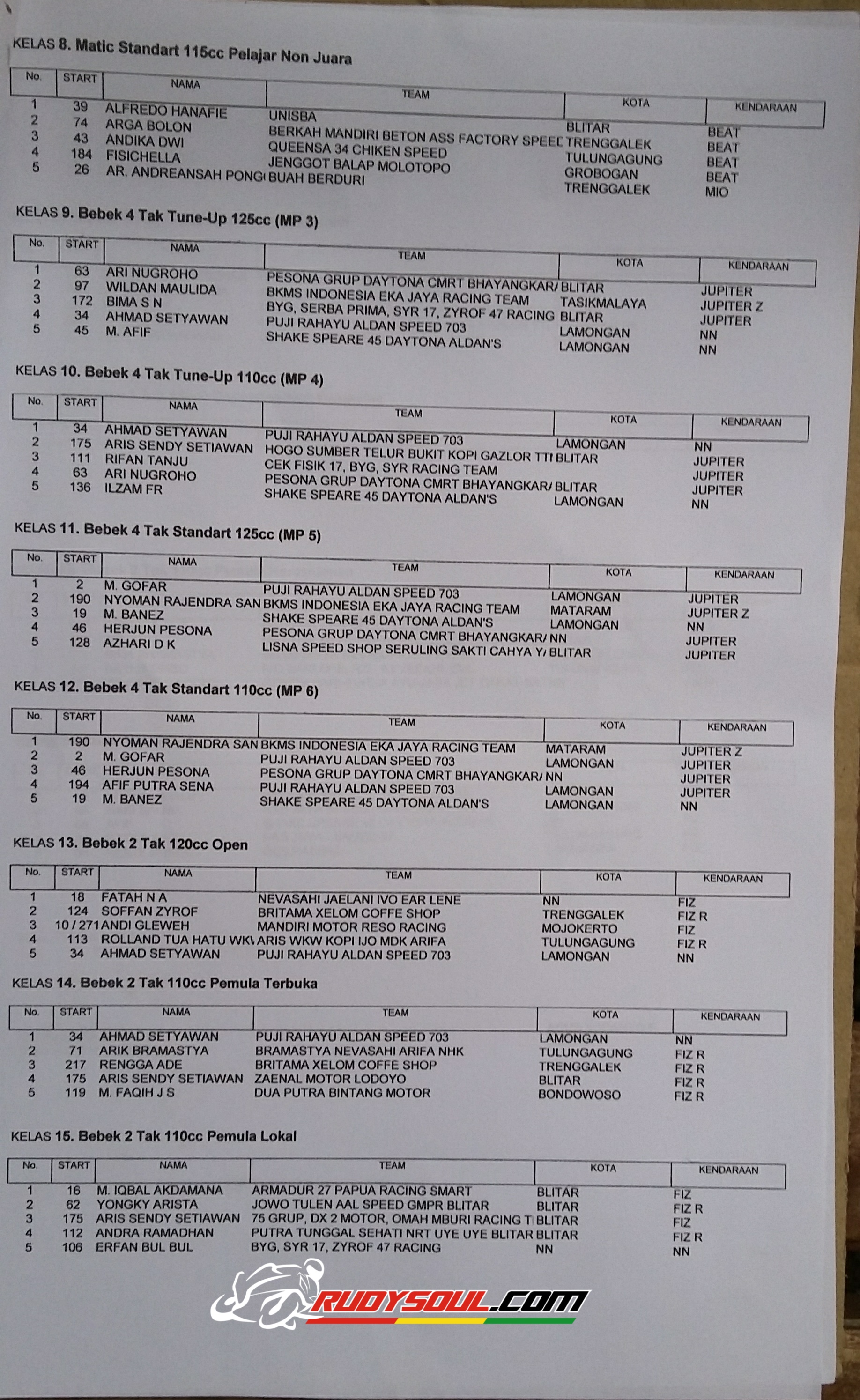Hasil Lengkap Road Race Matic Race Aeri 2 Blitar. Ditulis pada 14/03/2016 oleh Rudy SouL Sob,berikut hasil lengkap Matic Race seri 2 Blitar yang berlangsung di Sirkuit Stadion Supriadi Blitar Minggi (13/03). Semoga bermanfaat. Silahkan Share ke Teman Sobat. Bagikan ke X(Membuka di jendela yang baru) X Bagikan pada Facebook(Membuka di jendela yang baru) Facebook Bagikan ke WhatsApp(Membuka di jendela yang baru) WhatsApp Bagikan ke Linkedln(Membuka di jendela yang baru) LinkedIn Bagikan ke Telegram(Membuka di jendela yang baru) Telegram Lagi Berbagi di Tumblr(Membuka di jendela yang baru) Tumblr Cetak(Membuka di jendela yang baru) Cetak Kirim email tautan ke teman(Membuka di jendela yang baru) Surat elektronik Suka Memuat...