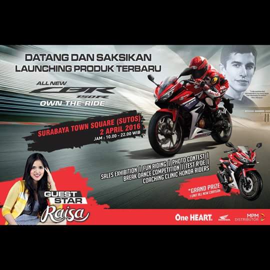 Sob,arek-arek Suroboyo ayooo..datang dan saksikan launching produk terbaru Honda “All New CBR150R” di Surabaya Town Square hari Sabtu 02 April 2016.
