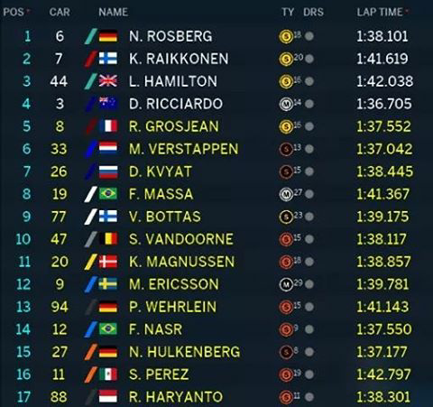 Pembalap Indonesia Rio Haryanto yang start dari posisi 21 mampu menyelesaikan 57 laps setelah dirace sebelumnya dirinya gagal finish karena mobilnya mengalami masalah transmisi.Sempat merangsek ke posisi 14 akhirnya Rio harus puas finish diposisi 17.
