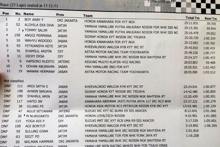 Berikut hasil lengkap MP1 Motoprix Malang 2016.