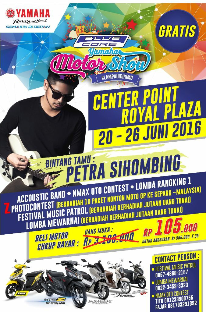 Bluecore Yamaha Motor Show 2016 turut dimeriahkan dengan kehadiran bintang tamu Petra Sihombing yang dapat ditonton secara gratis pada hari minggu, 26 Juni 2016. Ada pula lomba lomba yang hadir untuk memeriahkan acara tersebut dengan hadiah jutaan rupiah seperti lomba mewarnai, festival music patrol, lomba rangking 1, NMAX oto contest dimana puluhan motor NMAX modifikasi di lombakan secara bergengsi di acara tersebut, dan yang paling menarik adalah Z Photocontest dengan hadiah 10 paket nonton Moto GP ke Sepang – Malaysia. Z photocontest caranya cukup mudah teman-teman yang ingin mengikuti lomba tersebut langsung datang aja ke pameran tersebut dan langsung bisa mengexpresikan gaya foto gikil nya bersama Rossi dan Lorenzo di booth foto unik yang sudah kami sediakan, kemudian peserta bisa upload di social media nya masing-masing dengan hastag “caption unik”– nama #zagoanselfie #sentralyamahabasra #surabaya.