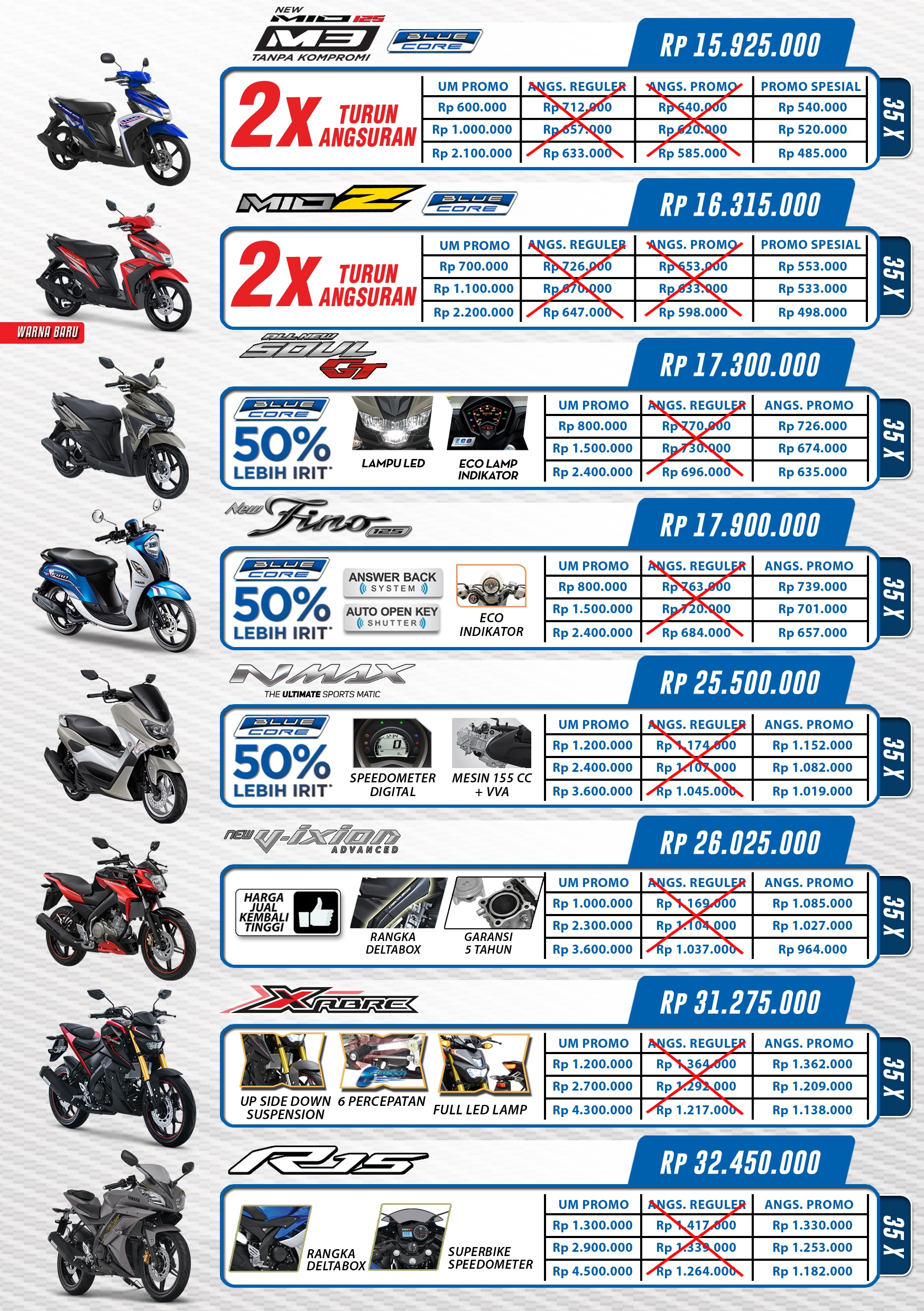 Setelah memberikan program “Merdeka Dari Angsuran Mahal” pada bulan Agustus 2016, Yamaha semakin memanjakan konsumen yang ingin memiliki motor Yamaha dengan “Semakin Merdeka Dari Angsuran Mahal”. Pada Program ini memiliki perbedaan yang signifikan pada program sebelumnya. Jika “Merdeka Dari Angsuran Mahal” konsumen hanya mendapatkan 1x potongan angsuran, kali ini konsumen mendapatkan potongan 2x angsuran dan yang pasti lebih murah.