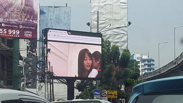 Gambar tersebut difokuskan pada sebuah videotron yang ada didepan kantor walikota jakarta selatan,anehnya videotron tersebut memutar video filem p#rn#.