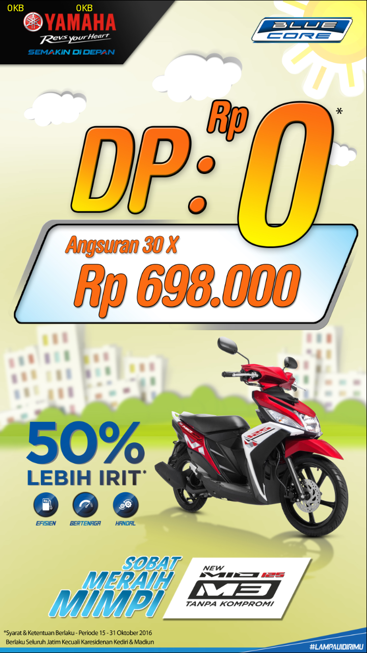 Sob,Pada bulan Oktober 2016 Yamaha memberikan program spesial kepada calon konsumen yang berkeinginan memiliki motor Yamaha Mio M3 125cc Bluecore. Konsumen akan dimanjakan dengan program MIO M3 DP 0. Program ini bertujuan untuk memudahkan konsumen untuk memiliki Yamaha Mio M3 all varian dengan DP (Down Payment / Uang Muka) RP 0 dengan angsuran selama 30x.
