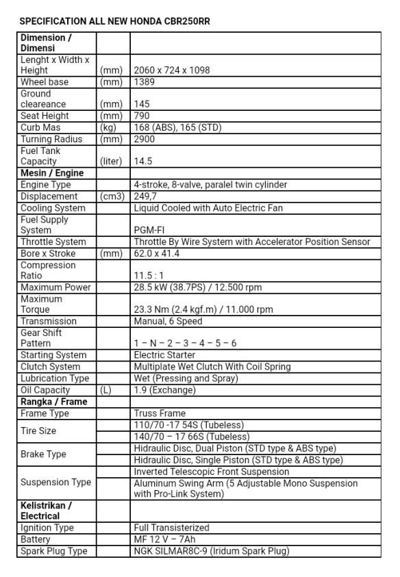 Sob,Honda dalam websitenya secara gamblang mengekuarkan spesifikasi All New Honda CBR250RR,tapi ada perbedaan spesifikasi awal dan spesifikasi teranyar yang dikirimkan ke email press release 3hari lalu.