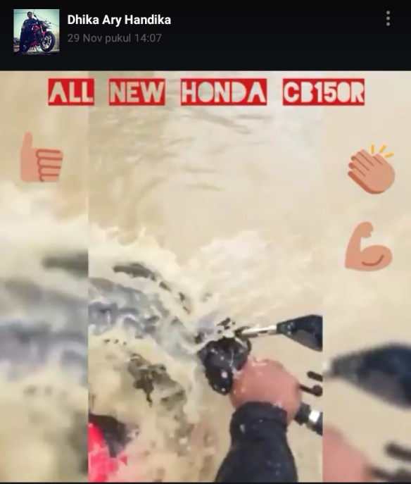 Sob,sebuah video menjadi viral difacebook,video dua orang yang sedang mengendarai motor CB150R nekat menerjang banjir dengan santai.Video ini diupload oleh Dhika Ary Handika diakun facebooknya.