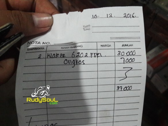 Badeweh ini sparepart kuat gak ya cuek aja wes yang penting sudah sampai dirumah,harganya 30ribu aja sepasang berarti sebijinya cuma 15ribu,Tambah kaget lagi pas bayar kekasirnya lhakok ongkos pasangnya cuma 7ribu.