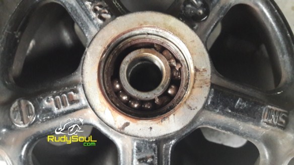 Saat mengalami gejala tersebut RudySouL langsung menepi dan mengecek kondisi bearing karena sudah curiga bearing ban depan bermasalah.Dan benar saja ternyata lubang as roda ban depan terlihat kotor oleh karat.