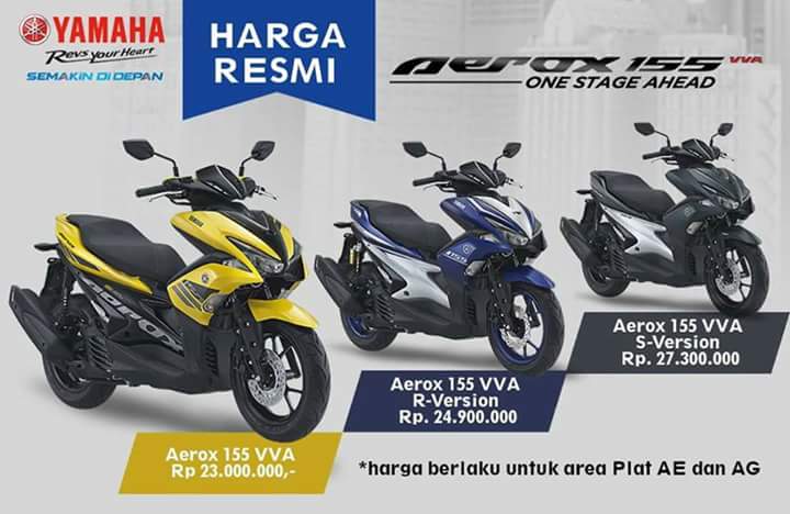 Harga Aerox 155 VVA untuk jakarta sudah resmi diumumkan Bagaimana dengan harga di daerah seberapa besar Selisih harganya, berikut rudysoul mengambil contoh harga OTR aerox 155 VVA untuk Jatim khususnya plat AG (karisidenan Kediri) dan Plat AE (karisidenan Madiun).Aerox 155 VVA untuk area Madiun dan Kediri tipe standart adalah Rp 23 juta rupiah atau selisih Rp 1.150 debgan harga OTR Jakarta (Rp 21,850).Type R Version Rp 24,9 juta selisih Rp 1,15 juta OTR Jakarta( Rp 23,75 ) Type S Version Rp 27 juta selisih Rp 1,15 juta selisih Rp 1,15 OTR Jakarta ( Rp 26,150).