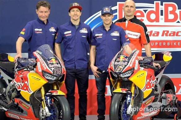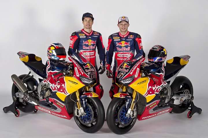 Sob,dua mantan pembalap motogp Nicky Hayden dan Stefan Bradl sekarang rekan satu tim di Honda Superbike menggunakan CBR Fireblade,sponsor utama dalah Red Bull…wuuiihh sangar tenan iki sob ada gambar bantengnya heheh 😅😎