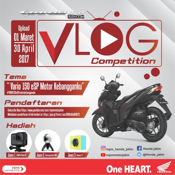 Sob,PT.MPM Distributor Main Diler motor Honda Jatim dan NTT punya program spesial dan khusus untuk para vlogger,tau kan yang dimaksud Vlogger…?yuppss.. Video Blog yang saat ini mulai banyak digemari para biker muda,merkam kegiatan saat berkendara dengan kamera action adalah suatu kebanggan terdendiri,enggak perlu nulis cukup nyalakan action camera dan ngomong gitu aja,hasil video mau diedit atau angsung dishare keyoutube monggo kerso terserah si vlogger.