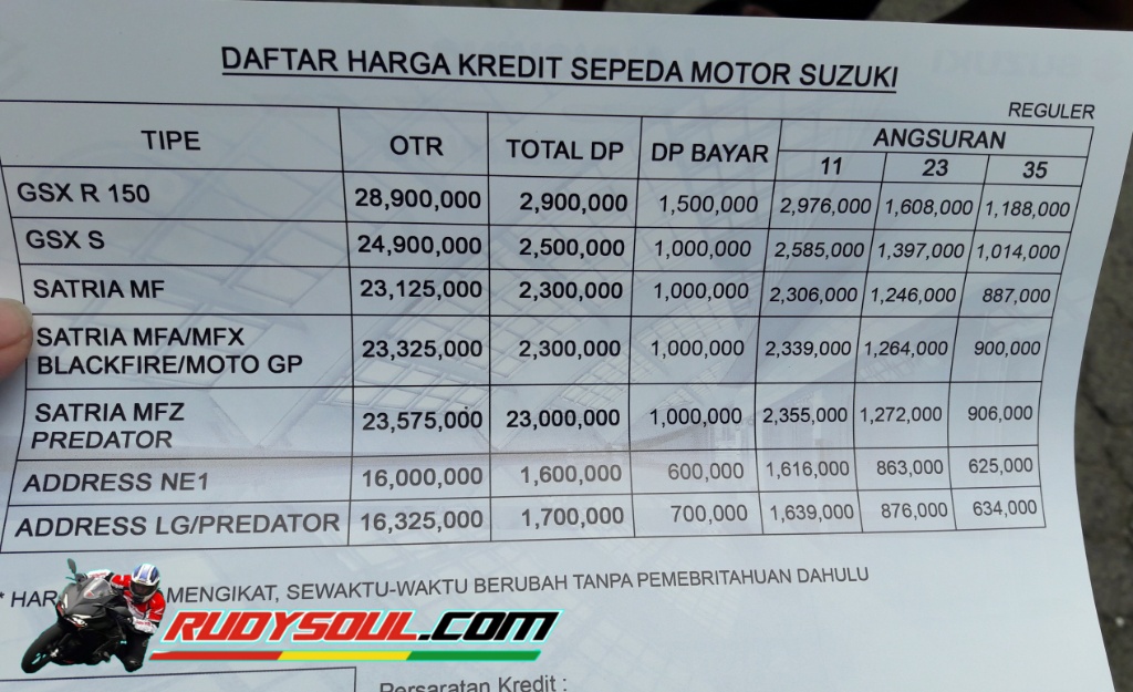 Harga bisa dikredit dengan Uang muka hanya Rp 1,5 juta dengan angsuran Rp 1,188 jutaan perbulan untuk GSX-R150 sedangkan GSX-S 150 uang muka cukup Rp 1juta dengan angsuran perbulanya Rp 1,014 juta saja,untuk lebih lengkapnya sobat bisa melihat tabel diatas.
