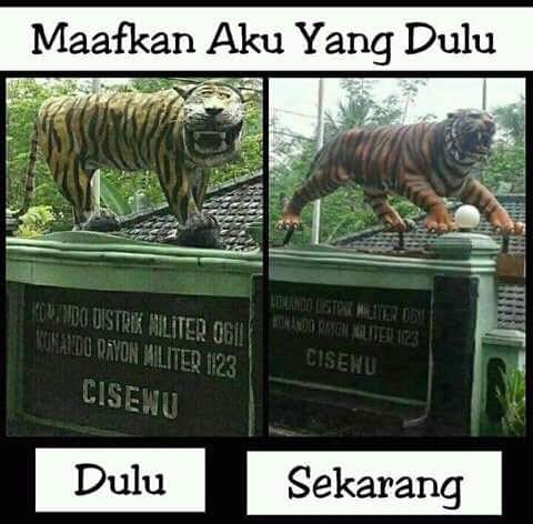 Sob, patung macan unyu beberapa hari ini menghibur dan bikin ketawa akhirnya dirobohkan/robohkan oleh Koramil Cisewu,Garut Jawa Barat setelah menjadi viral di masyarakat.Letkol Infantri Edin Chandra Hayat menginstruksikan agar Koramil mengganti patung harimau sesuai dengan acuan yang melambangkan kegagahan.