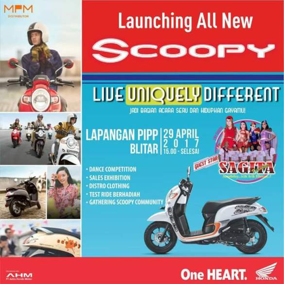 Buat sobat yang masih penasaran dengan all new Honda Scoopy Silahkan datang di acara launchingnya pada hari Sabtu malam Minggu tanggal 27 April vdi parkiran PIPP Blitar. Ada banyak hiburan yang siap membuat sobat betah di acara launching Honda Scoopy.Yaitu Dance Competition,Sales Exhibition,Distro Clothing,Test Ride Berhadiah dan Gathering Scoopy Community.