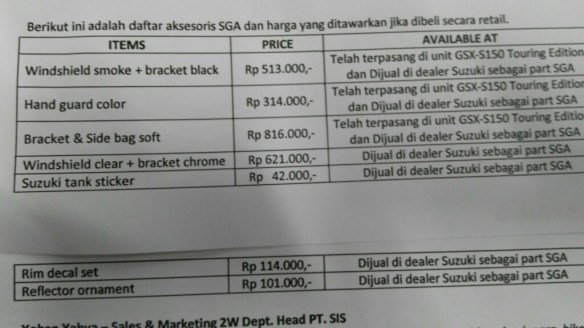 Ada beberapa item part asesoris yang tidak sama dengan GSX-S150 standart,yaitu Winsield smoke,Side box ,bracket dan hand guard,penambahan item part asesoris pada GSX-S150 edisi touring membuat harga motor ini mengalami perbedaan harga lebih mahal yaity Rp 25juta (OTR Jakarta),untuk harga part asesorisnya monggo cek daftar harganya berikut ini.
