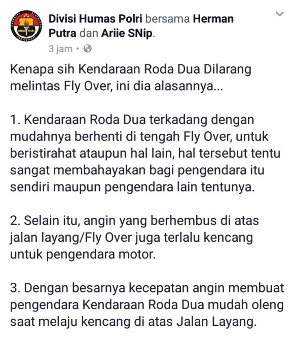 2. Selain itu, angin yang berhembus di atas jalan layang/Fly Over juga terlalu kencang untuk pengendara motor.