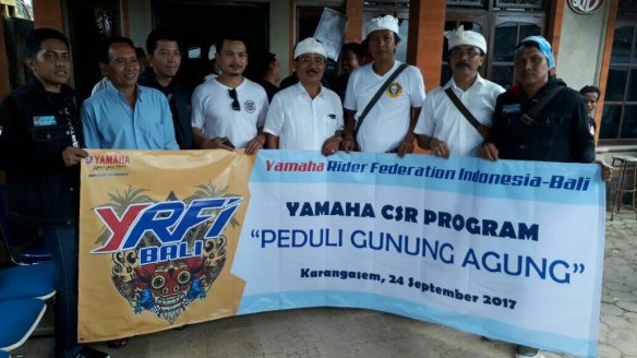 Yamaha turut menyalurkan bantuan untuk para pengungsi yang menghindari ancaman letusan Gunung Agung di Karangasem, Bali. Bantuan diberikan oleh PT Yamaha Indonesia Motor Manufacturing (YIMM) bekerjasama dengan YRFI (Yamaha Riders Federation Indonesia) dalam program “Peduli Gunung Agung”.