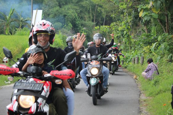 Terlihat terlihat di raut wajah mereka yang bahagia berkumpul bersama pengguna motor Yamaha X Ride. Mereka yang membawa keluarga anak dan istri pun tidak melupakan faktor keselamatan, rider dan boncenger mengenakan helm.