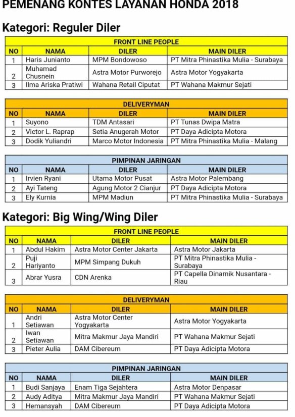 Memasuki pelaksanaan Kontes Layanan Honda ke-12 di tahun ini, AHM membagi kontes ini menjadi dua kelompok diler yaitu kelompok regular diler dan kelompok Wing diler atau Big Wing. Hal ini dilakukan sesuai perkembangan segmen konsumen sepeda motor Honda yang membutuhkan pelayanan semakin beragam. Dalam setiap kelompok terdapat tiga kategori yang dilombakan sesuai dengan perannya dalam melayani konsumen, yaitu pimpinan jaringan Honda, Deliveryman, dan Front Line People (FLP).