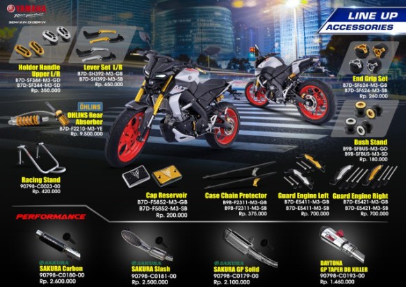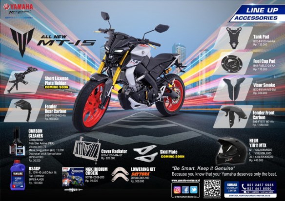 “Melihat tingginya antusiasme konsumen dalam melakukan modifikasi terhadap MT-15, Yamaha Indonesia berusaha memenuhi kebutuhan tersebut melalui peluncuran produk aksesoris resmi yang sudah teruji kualitasnya. Semoga dengan kehadiran berbagai aksesoris resmi ini, konsumen akan semakin terpacu dalam berkreasi mewujudkan motor yang dapat merepresentasikan karakter dan identitas diri mereka”, terang Yordan Satriadi, Deputy GM Marketing PT Yamaha Indonesia Motor Mfg.