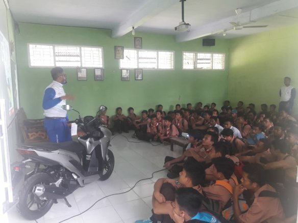 ” Sebagai bentuk kepedulian MPM kepada pelajar sebagai generasi muda penerus bangsa, kami berikan edukasi safety riding agar pelajar tetap Cari_Aman saat di jalan. Serta dapat membagikanya dilingkungan sekitar aekolah mauoin dirumah.” kata Dimas Satria selaku Instruktur Safety rmRiding MPM.