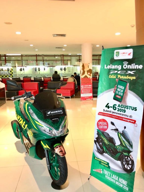 Type motor modif edisi persebaya kali ini adalah Honda PCX 150 Lelang motor modif spesial persebaya ini dibuka dengan harga lelang mulai Rp. 20.000.000. Selain berhak mendapatkan motor modif edisi persebaya, pemenang lelang akan mendapatkan 2 Tiket VIP Superfans, Helm dan Syal Exclusive Persebaya. Syarat dan ketentuan lelang dapat diakses melalui Link: http://www.mpmhondajatim.com/lelangmpm