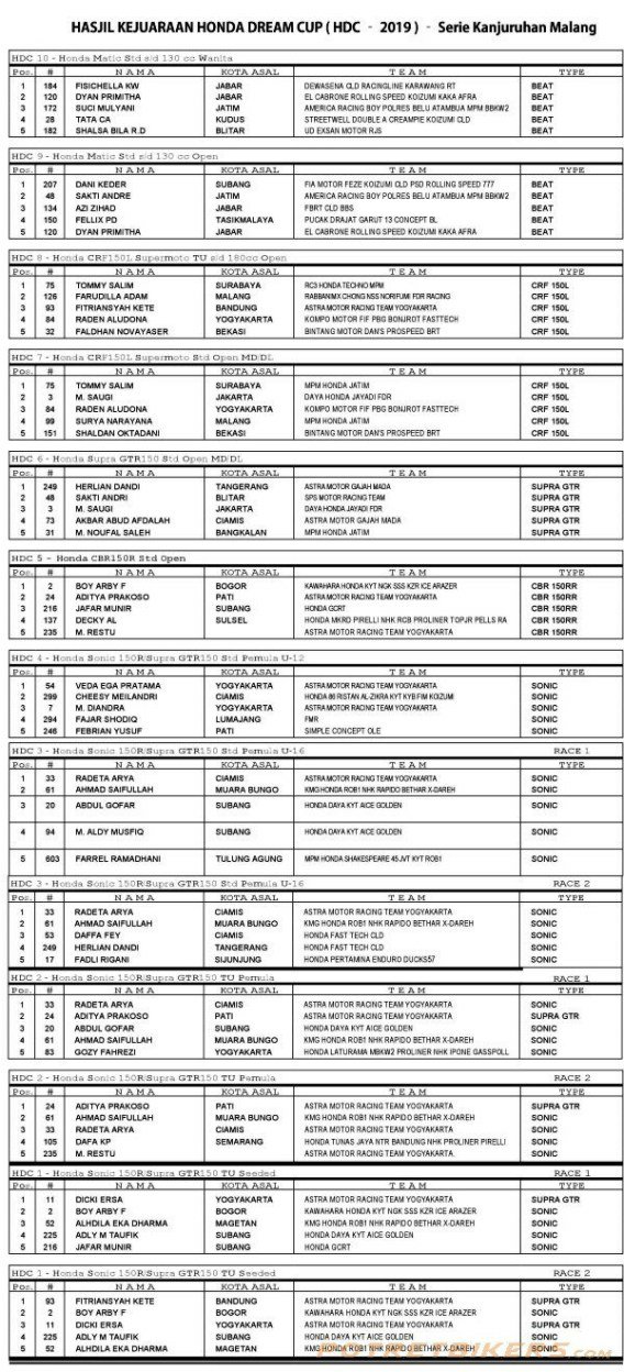 Total ada 10kelas yang dilombakan pada tahun ini,dengan 6 kelas sudah ada sebelumnya dan 4 tambahan kelas baru.Kelas baru yang dibuka pada tahun ini adalah diantaranya CRF150L Supermoto standart open (HDC7),Honda CRF150L Supermoto Tuneup s/d 180cc Open (HDC8).Ada juga kelas matik yang dibuka untuk menampung minat yang tinggi.Kualifikasi dilaksanan pada hari sabtu pagi hingga pukul 4 sore,Race berlangsung Minggu berjalan dengan cuaca yang cukup membuat keringat deras bercucuran,suhu udara padaa siang itu adalah 30°celcius. Namun demikian tidak menyurutkan minat masyarakat untuk datang langsung menyaksikan para pembalap beradu skill dilintasan.Buat sobat yang kemarin berhalangan melihat langsung berikut RudySouL share hasilnya.