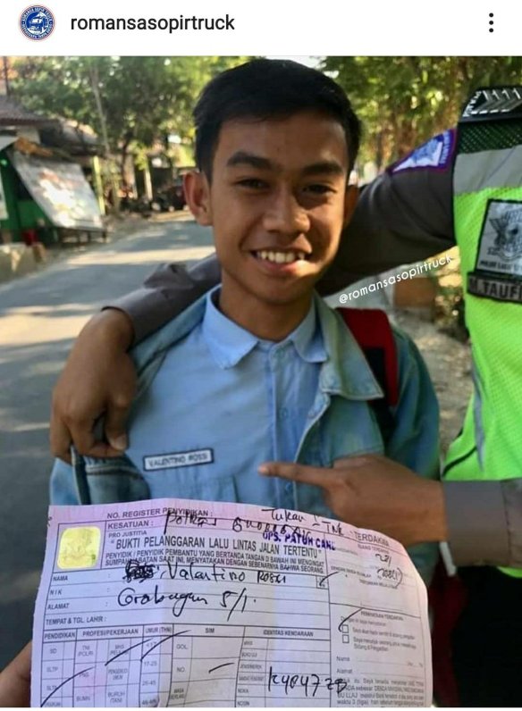 Foto ini di upload oleh akun isntagram @romansasopirtruck pada tanggal 21 September. Meskipun mendapatkan surat tilang terlihan Valentino Rossi tidak patah semangat dan tetap tersenyum.