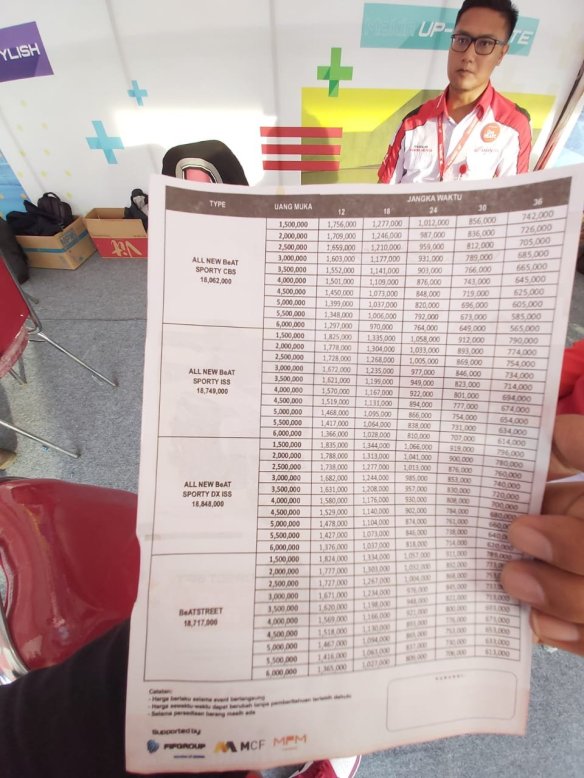 Pengunjung juga dapat melakukan perawatan motornya pada waktu acara berlangsung . MPM memberikan paket service murah 40 ribu.All New Honda BeAt terbaru mesin eSP 110cc yang lebih hemat bahan bakar dan menyuguhkan performa yang lebih optimal. Skutik yang dicintai masyarakat sejak tahun 2008 ini menggunakan rangka baru berteknologi eSAF (enhanced Smart Architecture Frame). Rangka yang diusung kini lebih lincah dan dapat meningkatkan stabilitas handling sehingga sepeda motor mudah dikendalikan dan nyaman saat dipakai bermanuver. Penggunaan rangka eSAF pada kedua model ini juga mampu memberikan pemanfaatan ruang yang lebih besar. Bagasi penyimpanan barang kini lebih luas dengan kapasitas 12 liter dan kapasitas tangki bahan bakar lebih banyak menjadi 4,2 liter.