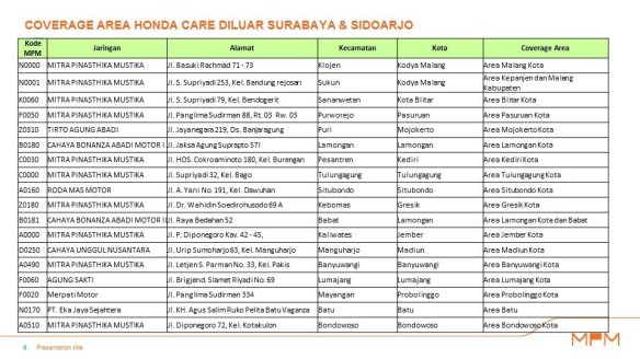 Layanan khusus ini menjangkau untuk konsumen yang ada di Jawa Timur dalam coverage PT MPM Distributor selaku distributor resmi sepeda motor Honda untuk wilayah Jatim dan NTT.