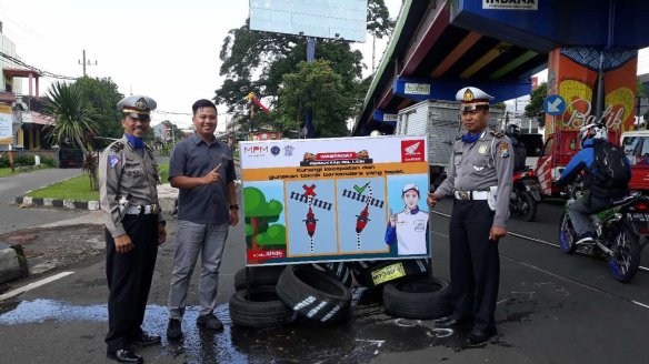 ” Kami bekerjasama dengan Dikyasa Polres Kota Malang memasang papan himbauan atau Cari_Aman melintasi rel kereta api dilengkapi dengan ilustrasi agar mudah dipahami oleh pengguna jalan khususnya R2 dan sudah terpasang di perlintasan kereta api sebidang di Jl A Yani atau lebih dikenal dengan arjosari yang kondisinya sering terjadi kecelakaan karena posisi perlintasan rel miring dan warga yang melintas dengan teknik yang salah. ” kata Dionizius Mizidianto selaku Instruktur Safety Riding MPM.