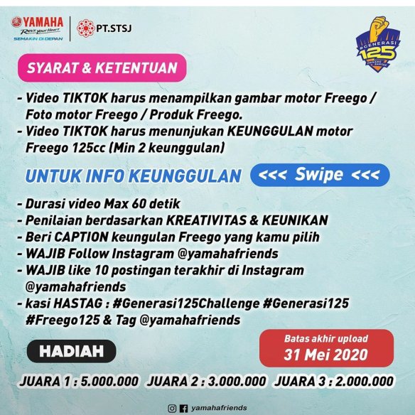 – kasih hashtag #generasi125challenge#generasi125 #freego125 dan tag @yamahafriends