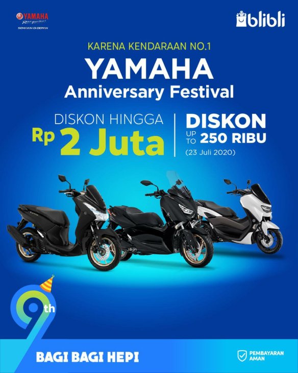 Mulai dari program Yamaha Anniversary Festival yang bekerjasama dengan salah satu startup Indonesia, program ini memberikan kesempatan bagus bagi konsumen untuk #NaikYamahaAja dengan harga yang spesial diskon 10 % dan diskon hingga 2 juta rupiah, berlaku nasional mulai 20 Juli – 31 Juli 2020. Beragam line up motor Yamaha dapat menjadi partner berkendara Anda yang digunakan sehari-hari di era new normal ini. Untuk lebih lengkap mengenai program Yamaha Anniversary Festival kunjungi link berikut ini: https://www.blibli.com/merchant/blibli-motor-unit-yamaha/BLM-60032