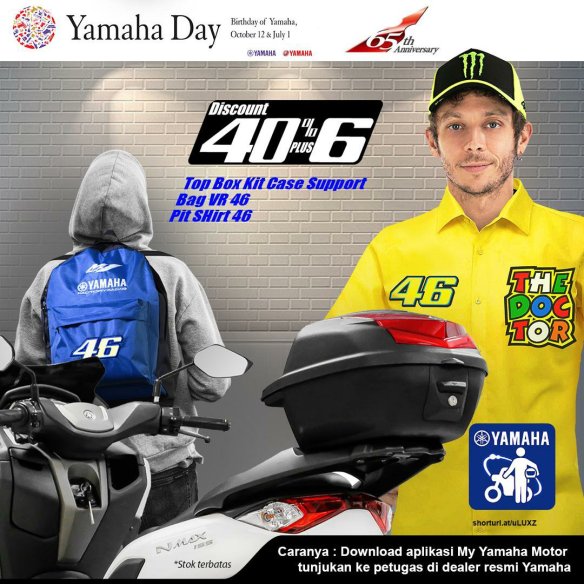 Penawaran khusus berikutnya untuk produk apparel dan aksesoris dengan potongan harga 40% + 6 dalam rangka ulang tahun ke-46 PT Yamaha Indonesia Motor Manufacturing (YIMM). Konsumen Indonesia dapat memperolehnya untuk produk aksesoris top box kit case untuk motor All New Nmax 155, produk apparel 46|ASIA seperti tas VR 46, dan pit shirt 46 di dealer-dealer resmi Yamaha di seluruh Indonesia berlaku sampai 31 Juli 2020.