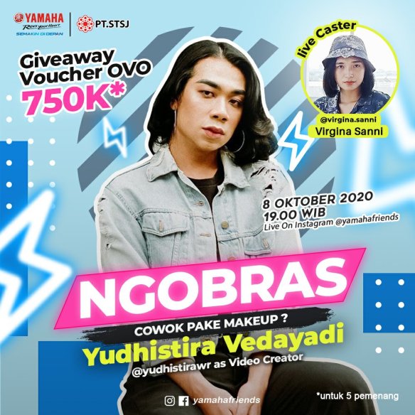 Sob,Pasti sudah gak asing sama acara Ngobras Yamaha Friends. Nah untuk sesi Ngobras minggu ini Kamis, 8 Oktober 2020 pukul 19.00WIB, kita akan menghadirkan youtuber yang punya konten unik dan menarik, siapa lagi kalok bukan Yudisthira El Vedayadi, yang mulai menggemari dunia Youtube sebagai beauty vlogger. Yudhistira ini satu diantara laki-laki yang jago dalam mengaplikasikan riasan wajah hingga membuat kaum hawa iri. Tidak jarang setiap video yang ia unggah di Youtube membuat gelak tawa.