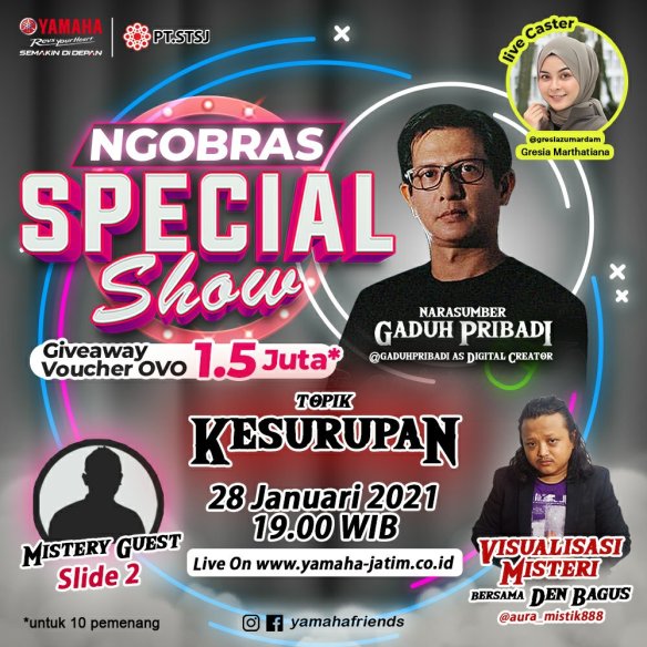 Sob,Ada yang spesial tapi bukan martabak. Ngobras Yamaha Friends edisi 28 Januari 2021 Special banget ! Kali ini bintang tamu akan di hadirkan secara langsung di studio Ngobras, jadi gak LDR an lagi. Topik yang akan diulas yakni tentang kesurupan, dimana kejadian ini sering terjadi disekitar kita. Jadi pasti sudah tau kan siapa bintang tamunya? Kita akan kedatangan Gaduh Pribadi sebagai narasumber utama yang akan membahas tentang “Kesurupan”.