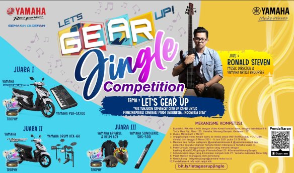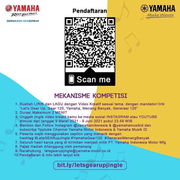 Ayo Generasi 125! GEAR UP karya terbaik kamu untuk menginpirasi Generasi Muda Indonesia. Kamu Bisa, Indonesia Bisa! Untuk pendaftaran dan informasi selengkapnya dapat langsung akses link bit.ly/letsgearupjingle atau email melalui letsgearupjingle@yamaha-motor.co.id.