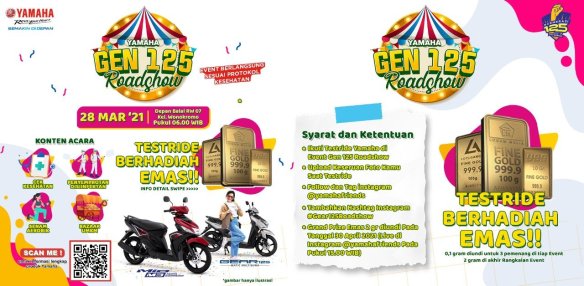 Sebagai inti acara, Yamaha Jatim memberikan kompetisi menarik yaitu TESTRIDE BERHADIAH EMAS. Disini, warga yang bersedia untuk test ride unit Gen 125 akan mendapatkan hadiah emas dengan mengikuti beberapa syarat berikut :