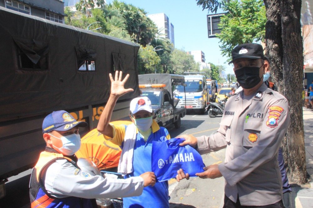 Paket sembako yang berisikan beras, minyak goreng, mie instan dan gula dibagikan oleh Satbinmas (Satuan Pembinaan Masyarakat) pada pagi hari disekitar area Tugu Pahlawan dan Blauran Surabaya. Paket dibagikan secara jemput bola, dimana pihak Satbinmas yang mendatangi warga yang membutuhkan. Selain membagikan sembako pada masyarakat kecil seperti pedagang kaki lima, supir ojek online dan masyarakat kecil lainnya agar membantu pemenuhan kebutuhan mereka selama PPKM.